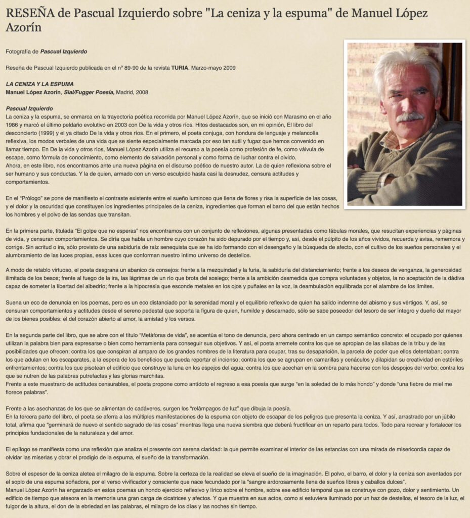 - Revista Turia, número 89-90 (Marzo-Mayo 2009). Reseña sobre La ceniza y la espuma de Manuel López Azorín.
