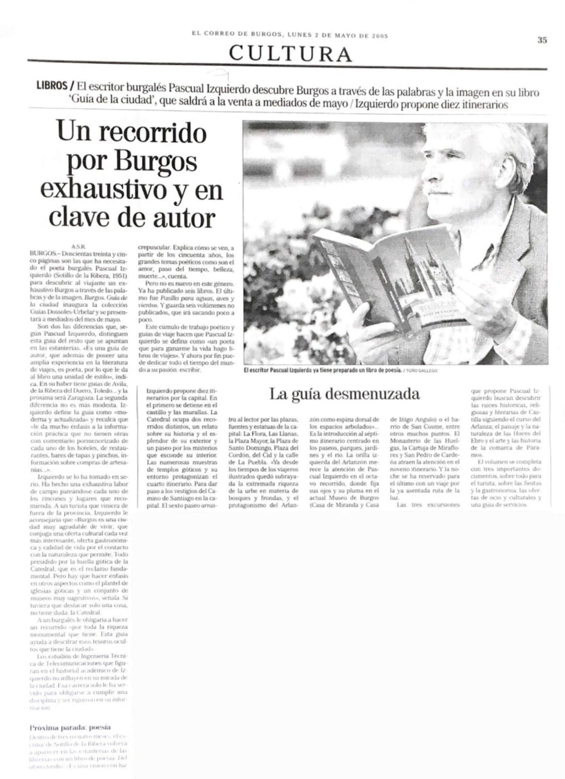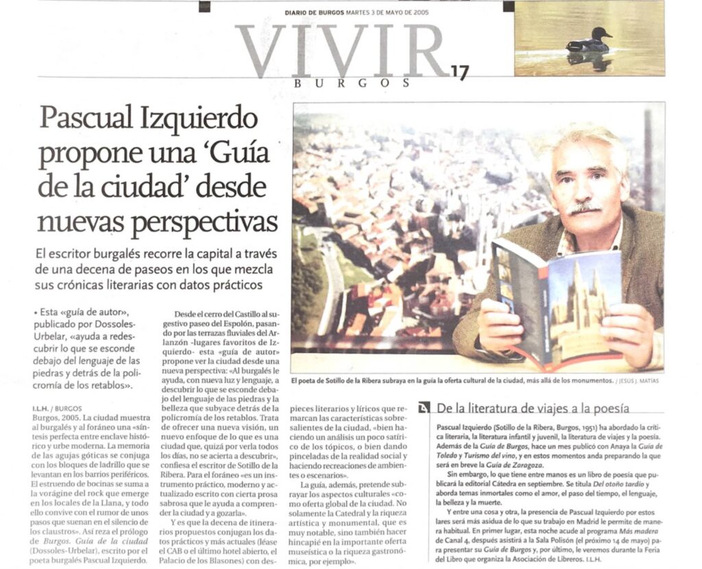 A lo anterior se añade una colección de sueltos que presentan una visión actualizada, irónica en ocasiones, de los tópicos que rodean la ciudad del Arlanzón. Todo ello escrito con una prosa sazonada y ágil, capaz de combinar información con brotes de lirismo y que, a veces, esboza una mirada suavemente crítica sobre los excesos de la modernidad.
