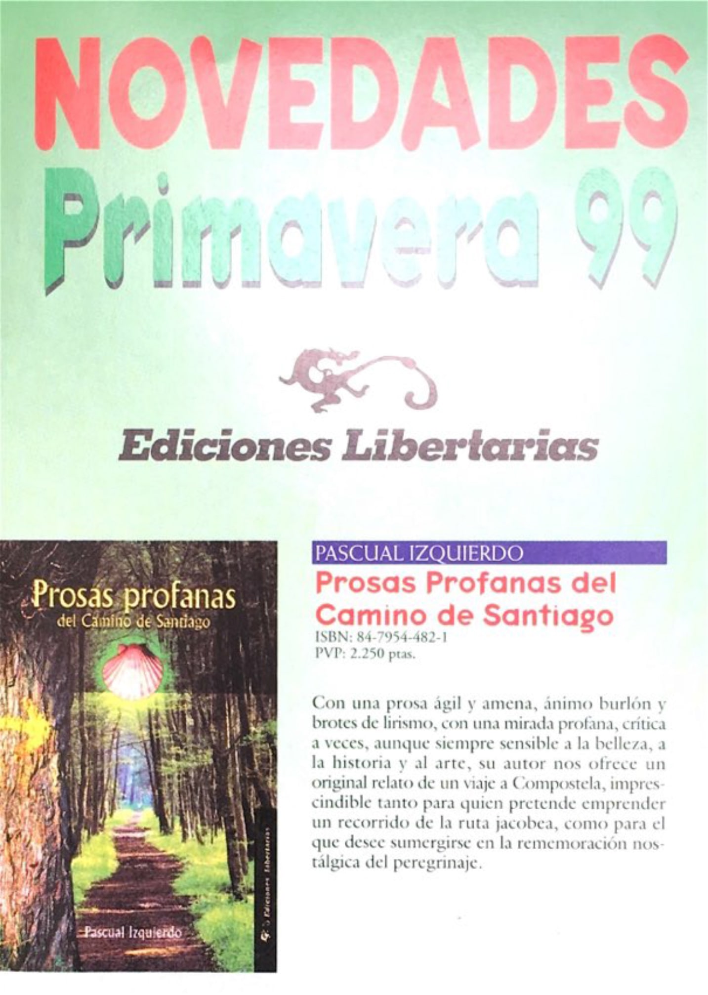 Este libro recoge las impresiones, anécdotas, fantasías, vivencias, apuntes de paisaje, reflexiones y comentarios procedentes de un viajero que, acompañado de un grupo de amigos, ha recorrido el Camino de Santiago con una mirada profana, crítica a veces, aunque siempre sensible a la belleza y enamorada de la historia y el arte. Además de calles e iglesias, catedrales y villas, aldeas y cenobios, sendas y ermitas, puentes y ríos, páramos y fuentes, se dan cita en esta obra un variado conjunto de personajes relacionados con la calzada santiaguesa: peregrinos, curas, frailes, sacristanes, enseñantes de iglesia, mozos de comedor, hospitaleros, mozas diversas…