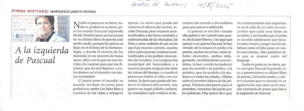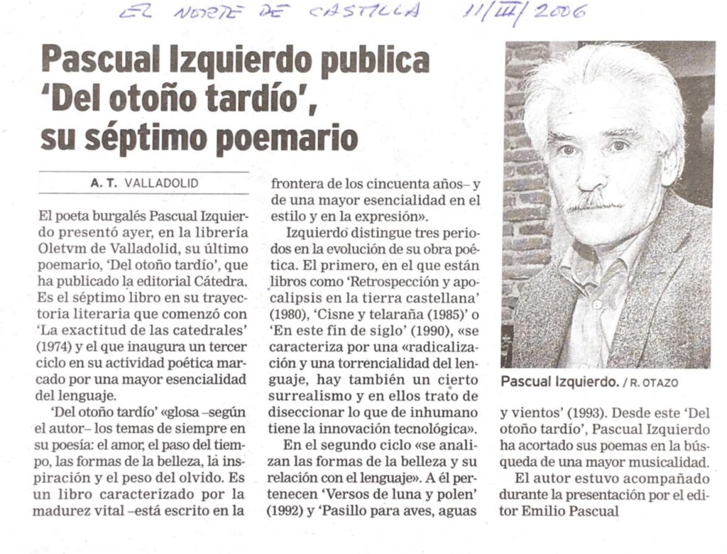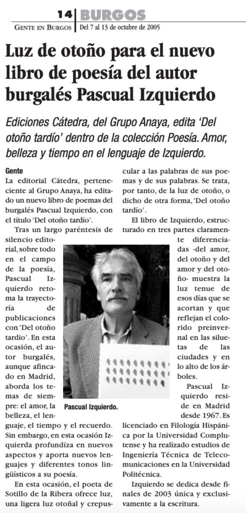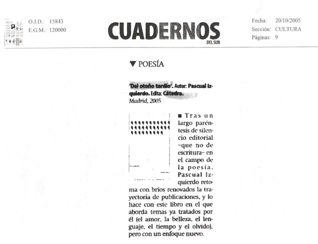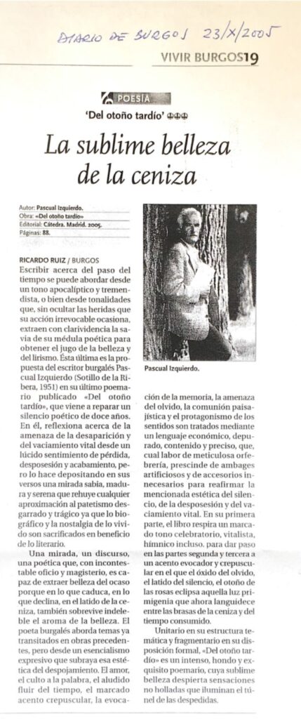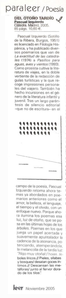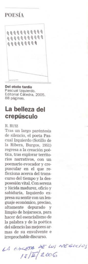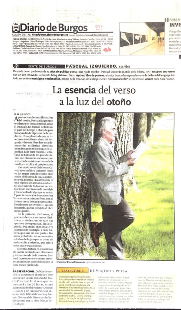 Visión crepuscular, a modo de falsa despedida, de quien contempla la vida subido en un incierto púlpito de letras y sombras. Iluminado por la luz tardía del otoño, el poeta se asoma al amor, al fragor del lenguaje, al misterio de la poesía y también al silencio.